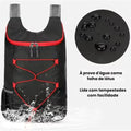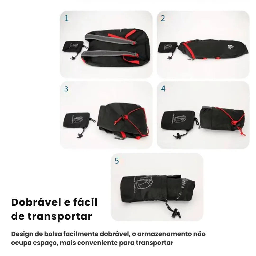 Pesando apenas 85g, é feita em poliéster impermeável e resistente a rasgos, suportando o uso intenso sem perder qualidade.
