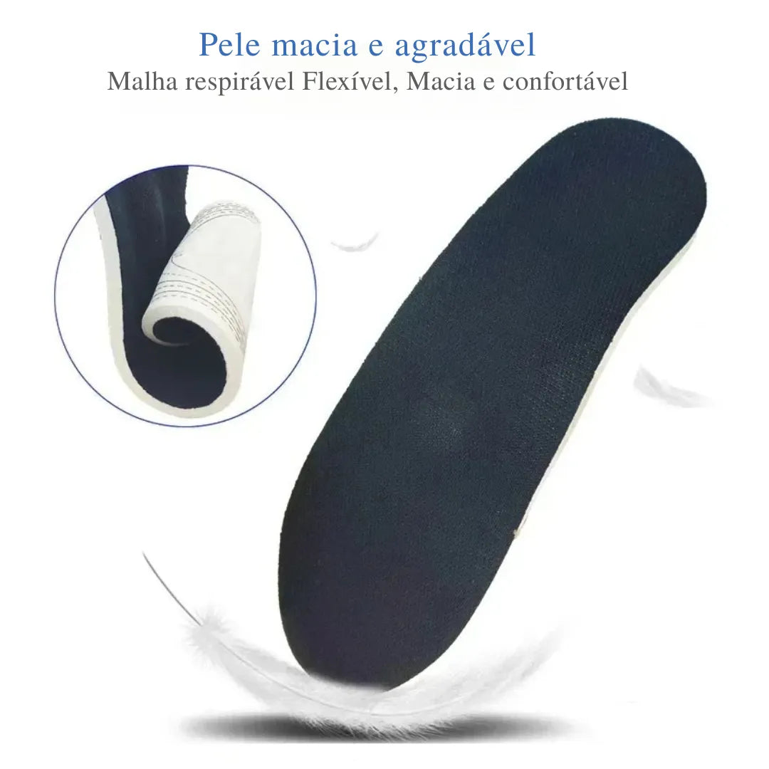 O formato anatômico corrige a postura dos pés, auxilia no alinhamento das pernas (O/X) e melhora o equilíbrio. O design em grelha garante circulação de ar, mantendo os pés frescos mesmo em uso prolongado.