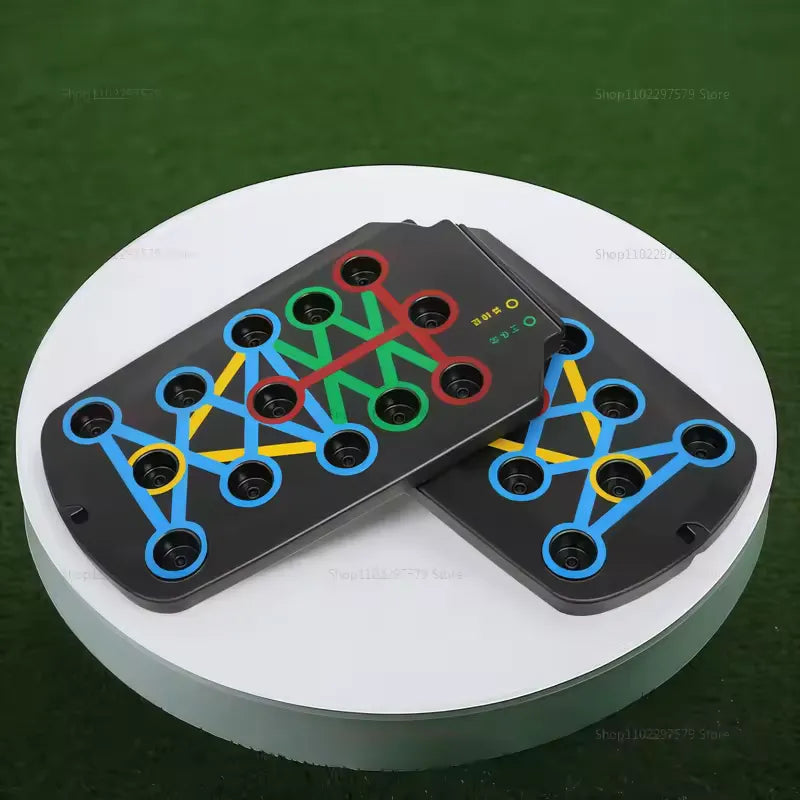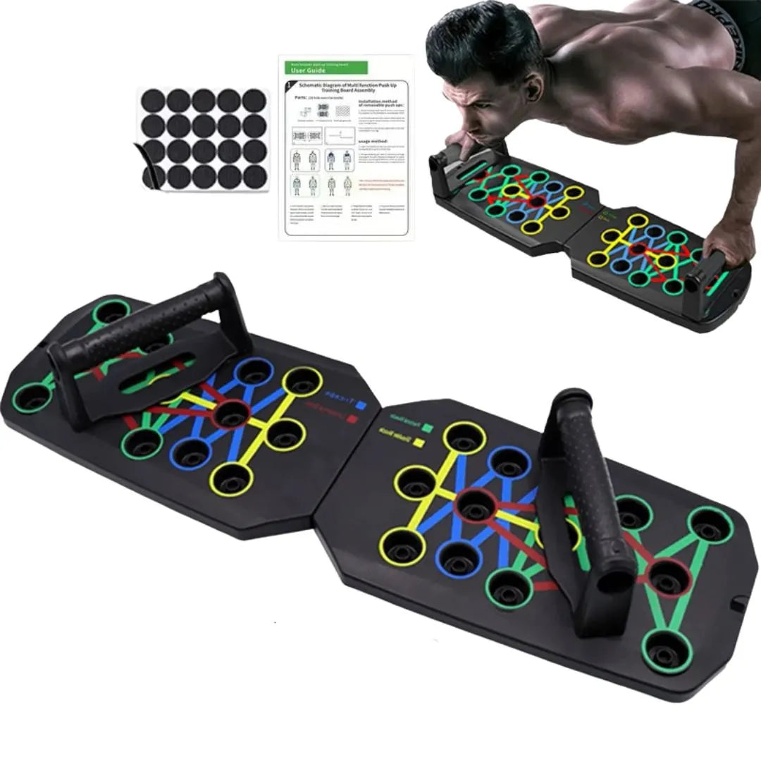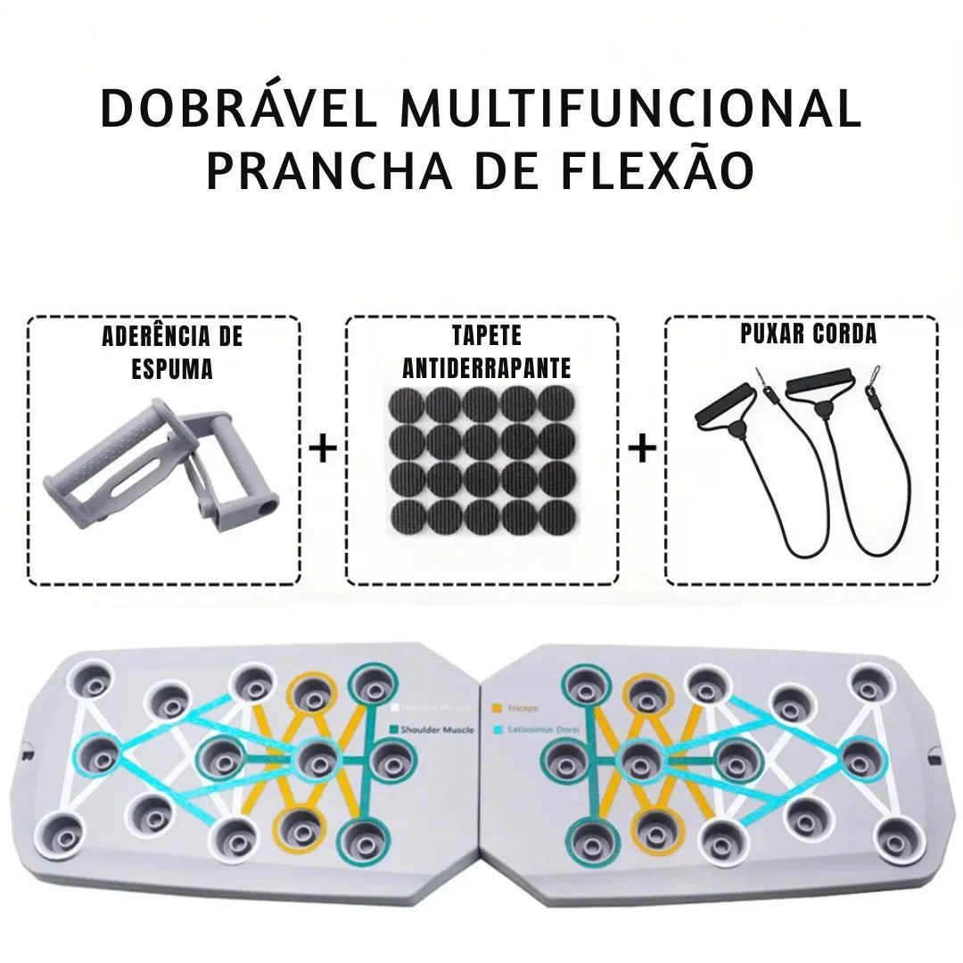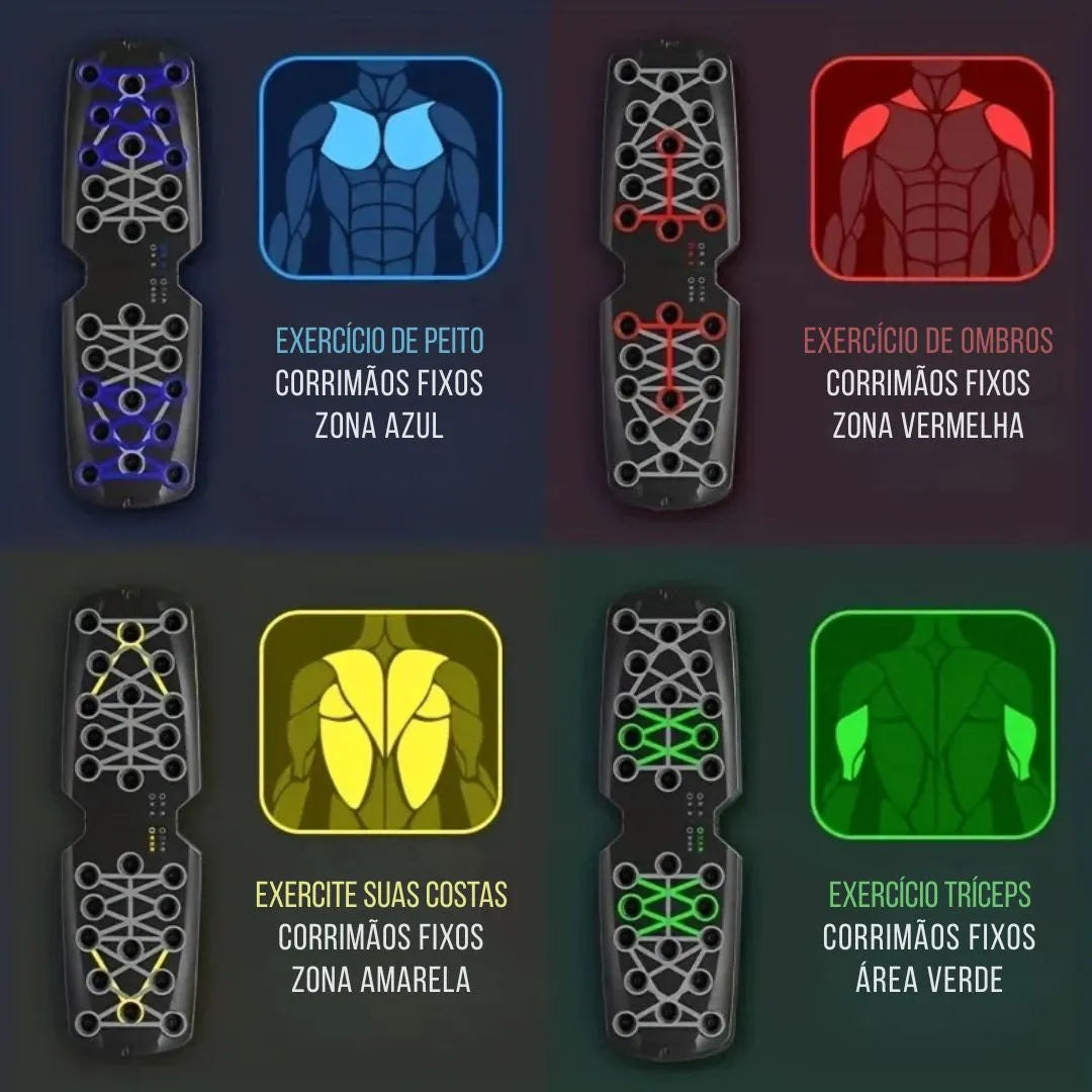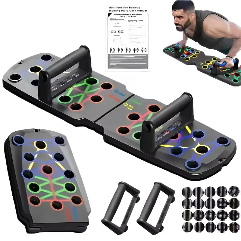 A PushBoard Multifuncional Dobrável foi projetada para trabalhar diferentes grupos musculares de forma direcionada e eficiente. Com um sistema de placas codificadas por cores, você escolhe quais músculos quer ativar: peito, costas, ombros ou braços.